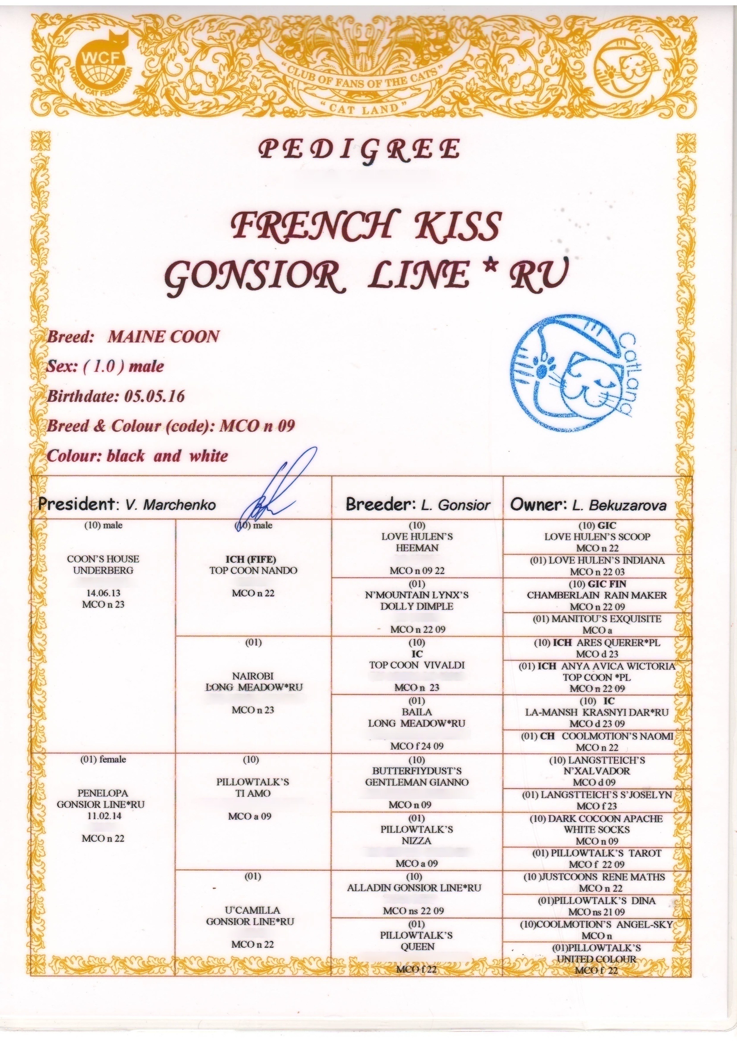 French Kiss Gonsior Line*RU Gender :Male Color:MCO n 09 Birthday :04.05.2016 Father:Coon‘s House Underberg Mother:Penelopa Gonsior Line*RU Photos Pedigree