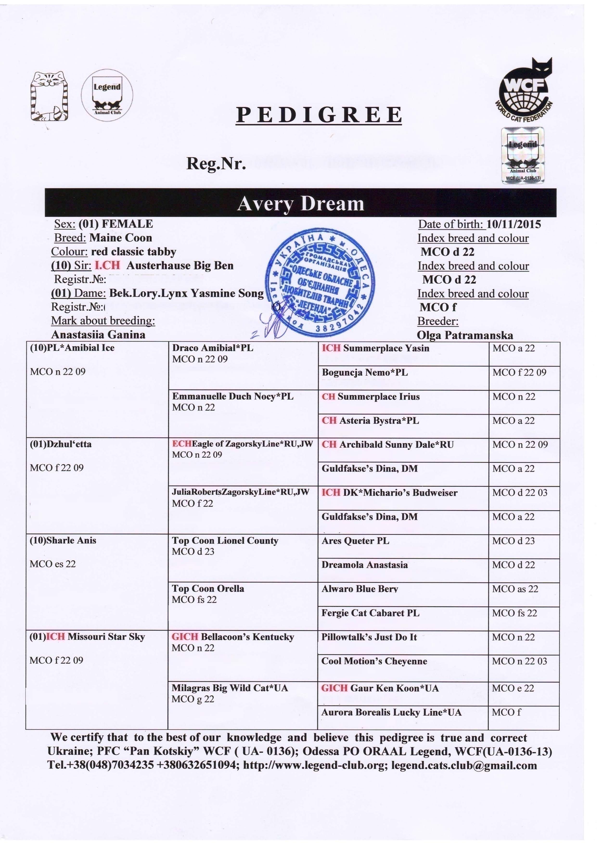 VIVAT COOON*UA Avery Dream Gender :Female Color:d 22 Birthday :09.11.2015 Father:I.CH Austerhause Big Ben Mother:Beklory.Lynx Yasmine Song Photos Pedigree